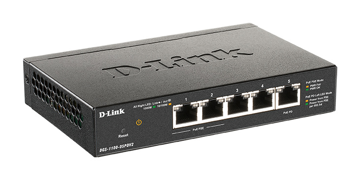 D-Link DGS-1100v2 je nová generace Gigabit Smart řízených přepínačů určených pro malé a střední podniky (SMB), pracovní skupiny (workgroup) a kanceláře (SOHO). Model DGS-1100-05PDv2 je kompaktní 5-portový 10/100/1000M switch napájený přes PoE dle standardů 802.3af/802.3at, nelze napájet pomocí externího adaptéru či ze zdroje 230V. Switch podporuje funkci PoE Pass Through pro napájení až dvou připojených zařízení dle PoE 802.3af, s celkovým PoE výkonem max. 18W při napájení switche z 802.3at PoE+ nebo max. 8W při napájení switche z 802.3af PoE. Switch je osazen 5 metalickými porty 1000Base-T RJ-45, kde jeden port je PoE-PD (PoE Powered Device) a dva porty jsou PoE-PSE (Power Sourcing Equipment).