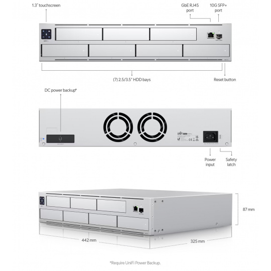 NVR má výkon pro nahrávání až 60 kamer ve Full HD rozlišení nebo 20 kamer ve 4K rozlišení a uchováním záznamu po dobu 60 dnů. NVR podporuje až 7 diskových pozic pro SSD/HDD s maximální kapacitou 16TB/disk, podporuje RAID 1/5/10 pro vyšší spolehlivost uchování dat, má 3" dotykový displej, který s pozdější verzí bude umožňovat i náhled videa, Gigabit LAN port, SFP+ port s podporou rychlostí 1G/10Gbps a redundantní napájení pomocí UniFi SmartPower (USP-RPS).