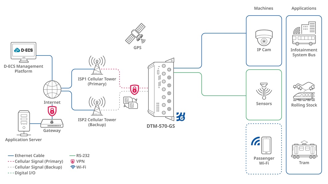 Transitní brána DTM-570-GS 5G poskytuje robustní mobilní připojení 5G NR a LTE pro bezdrátový uplink a downlink a je vybavena čtyřmi gigabitovými ethernetovými porty s kódováním M12/X pro připojení lokálních zařízení. Toto řešení hladce integruje poskytovatele služeb, cestující, vozidla, Wi-Fi6 AX1800, certifikaci pro železniční dopravu, široký rozsah vstupního napětí a pozemní systémy do jednotné sítě, bezproblémově propojuje IP kamery, senzory RS232 a další místní zařízení, takže je ideální pro náročné aplikace IoT v tranzitním prostředí.