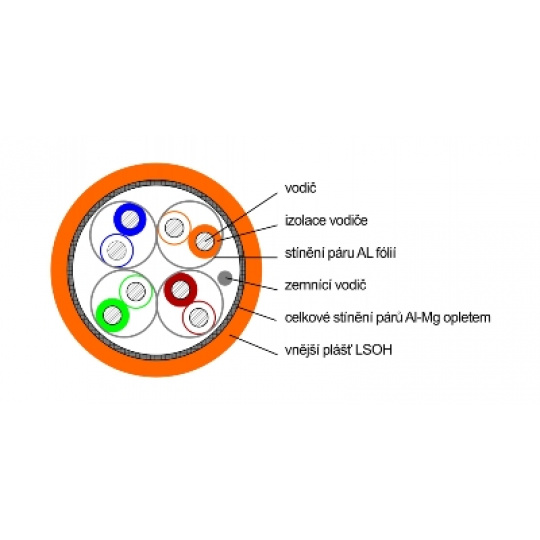 - stíněné provedení S/FTP (Oplet celkově, jednotlivé páry AL fólií)
