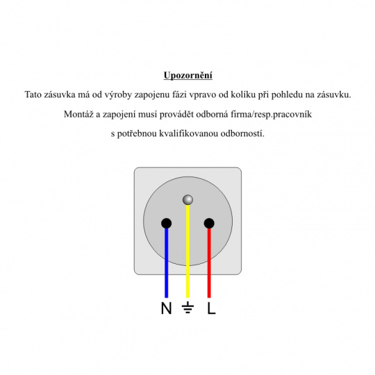 Tato zásuvka má od výroby zapojenu fázi vpravo od kolíku při čelním pohledu na zásuvku.