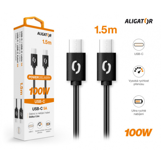 Datový kabel ALIGATOR POWER 100W, USB-C/USB-C 5A, 1,5m černý