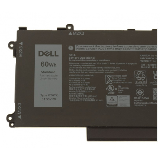 Stále cestujete? Už si nemusíte dělat starosti s omezenou výdrží baterií! Svůj notebook můžete napájet touto 3-článkovou lithium-iontovou baterií Dell™. Díky kapacitě až 60 Wh vám baterie umožní bezproblémovou práci na služebních cestách i na dovolené. Tato baterie vám poskytne nepřetržité a spolehlivé napájení, které potřebujete pro co nejlepší využívání notebooku. Lithium-iontové baterie vydrží déle než běžné baterie a nevyžadují tak častou výměnu. Tento produkt byl testován a ověřen v laboratořích Dell. Pokud jej použijete v notebooku Dell, vztahuje se na něj technická podpora společnosti Dell.