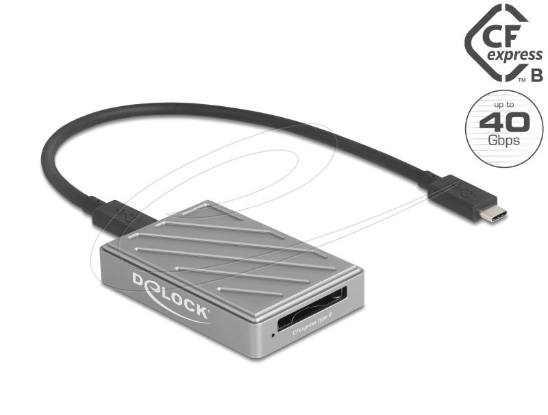 Čtečka karet od Delocku může být použita pro čtení a zápis na CFexpress paměťové karty. Čtečka karet může být připojena k PC nebo mobilnímu zařízení přes rozhraní USB. Díky podpoře maximální přenosové rychlosti až 40 Gbps lze i velké objemy dat – jako například videonahrávky s rozlišením 8K nebo série snímků ve formátu RAW – přenášet mimořádně rychle. Tato čtečka karet je proto ideální pro profesionální uživatele v oblasti fotografie a videa.