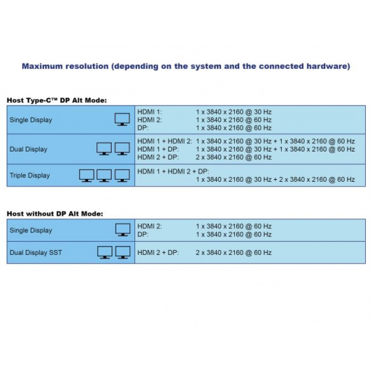 Zaručit lze rozlišení nejvýše 4K na všech portech, bez ohledu na operační systém. Vzhledem k čipové sadě grafické karty lze používat funkce zrcadlení a rozšíření obrazovek na DisplayLink® v operačních systémech Windows a Mac OS.