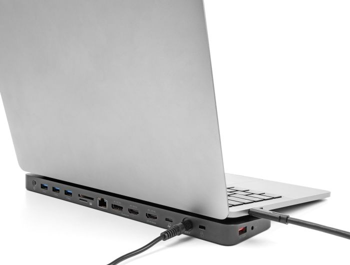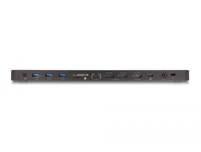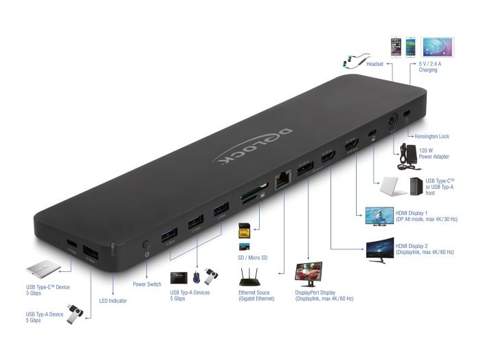 Tuto dokovací stanici značky Delock lze k počítači připojit rozhraním USB-C™ DP Alt Mode, Thunderbolt™ 3 nebo Thunderbolt™ 4 a poskytuje několik různých rozhraní. Na výstupech pro monitory lze provozovat až tři monitory současně. Pět integrovaných portů USB 5 Gbps umožňuje používat periférie a jiný port USB lze používat k nabíjení mobilních zařízení. Funkcionalitu zařízení doplňují konektory sluchátek, přípojka sítě Gigabit a čtečka karet na paměťové karty SD a Micro SD. K zásuvce Kensington lze připojit bezpečnostní kabel na ochranu dokovací stanice před krádeží.
