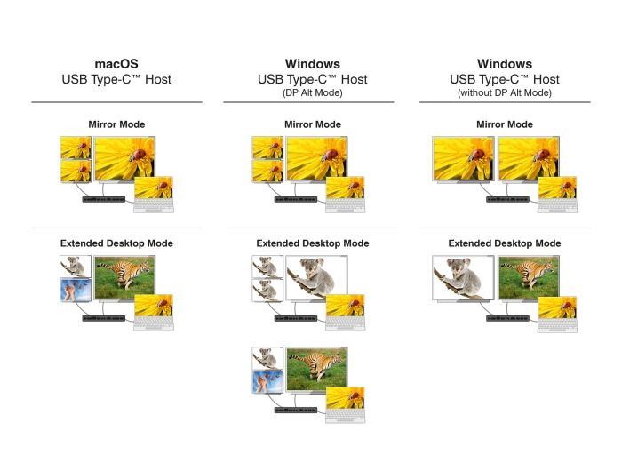 Při používání tří video výstupů současně je jeden monitor provozován v alternativním režimu DisplayPort Alt Mode a ostatní dva přes DisplayLink®. Dokovací stanici Delock lze provozovat také na zařízeních bez portu USB Type-C™ s podporou DP Alt Mode a s video výstupem na nejvýše dvou monitorech.