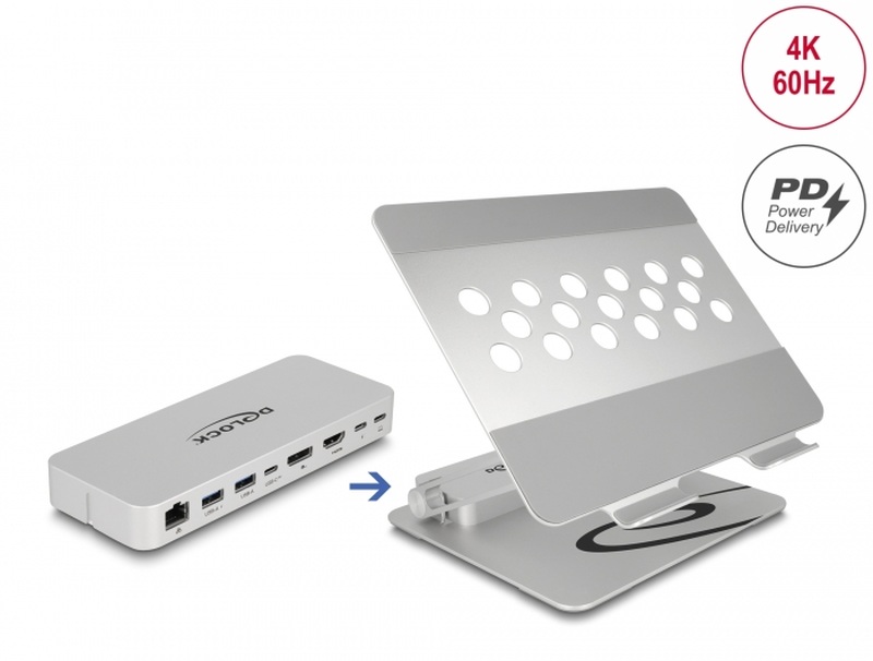 Delock Držák tabletů a laptopů s integrovanou dokovací stanicí 4K - HDMI / DisplayPort / LAN / Hub / HDR / PD