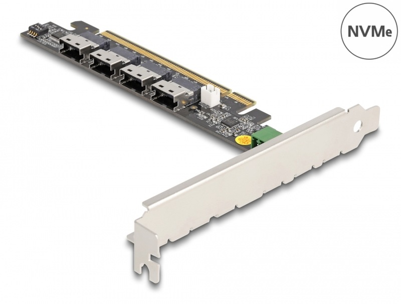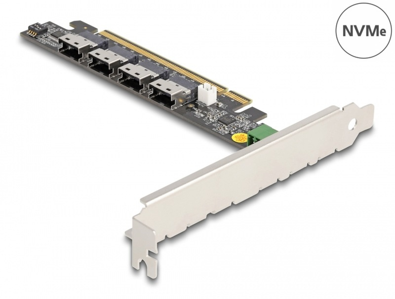 Tato PCI Express karta značky Delock rozšiřuje PC o čtyři rozhraní SFF-8654. K těmto portům lze volitelným kabelem připojit SSD s rozhraním například U.2. Karta přenáší PCI Express signály pomocí NVMe protokolu.