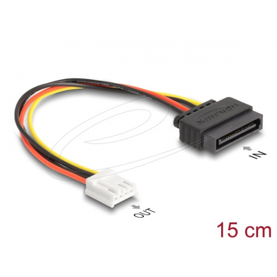 Delock Napájecí kabel SATA, z 15 pinové zástrčky na 1 x 4 pinovou zásuvku disketové mechaniky floppy, 15 cm