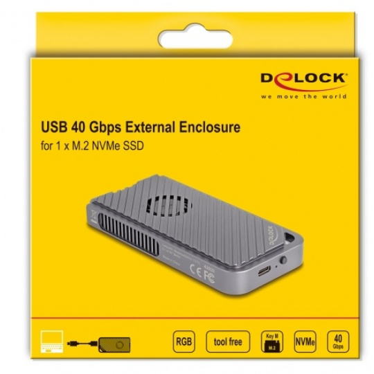 Vzhledem ke kompatibilitě s USB 40 Gbps lze pouzdru Delock připojit k portům rozhraní Thunderbolt™ 3 a 4, jakož i ke všem portům USB Type-C™. Maximální datová přenosová rychlost závisí na hostitelském zařízení.