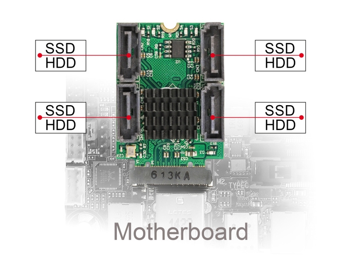 Tento Delock konvertor rozšiřuje systém o čtyři SATA porty. Pokud používáte vice jak jeden SATA port, je tady možnost užití různých RAID módů. Převodník podporuje funkci hyperduo. Při téhle funkci lze kombinovat SSD a HDD, a využívat výhod obou datových nosičů, rychlost SSD a kapacitu HDD.