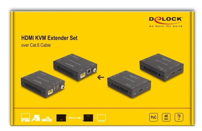 Tato sada prodlužovače HDMI značky Delock slouží k přenášení videosignálu a zvukového signálu s vysokým rozlišením a signálu infračerveného řízení po jediném síťovém kabelu. Při rozlišení 4K 60 Hz je možné dosáhnout vzdáleností až 70 m. Tato sada najde široké využití v konferenčních místnostech, při dálkovém vzdělávání nebo u velkých obrazovek.