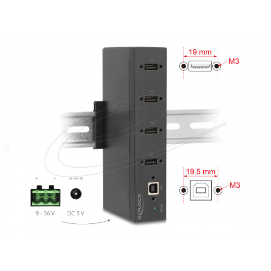 Tento odolný průmyslový USB Hub značky Delock lze připojit k počítači přes rozhraní USB Typu-A. Rozšiřuje počítače o čtyři konektory USB Typ-A.