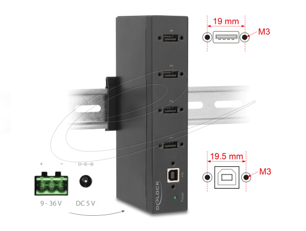 Tento odolný průmyslový USB Hub značky Delock lze připojit k počítači přes rozhraní USB Typu-A. Rozšiřuje počítače o čtyři konektory USB Typ-A.
