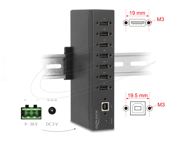 Tento odolný průmyslový USB Hub značky Delock lze připojit k počítači přes rozhraní USB Typu-A. Rozšiřuje počítače o sedm konektory USB Typ-A.