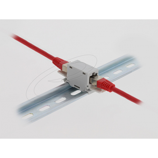 Delock Spojka RJ45, Cat.6A, ze zásuvky na zásuvku, s protiprachovou krytkou, k montáži na DIN, šedá