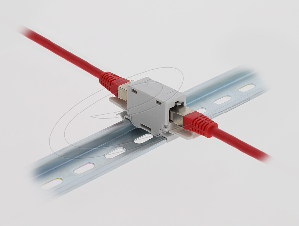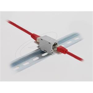 Delock Spojka RJ45, Cat.6A, ze zásuvky na zásuvku, s protiprachovou krytkou, k montáži na DIN, šedá