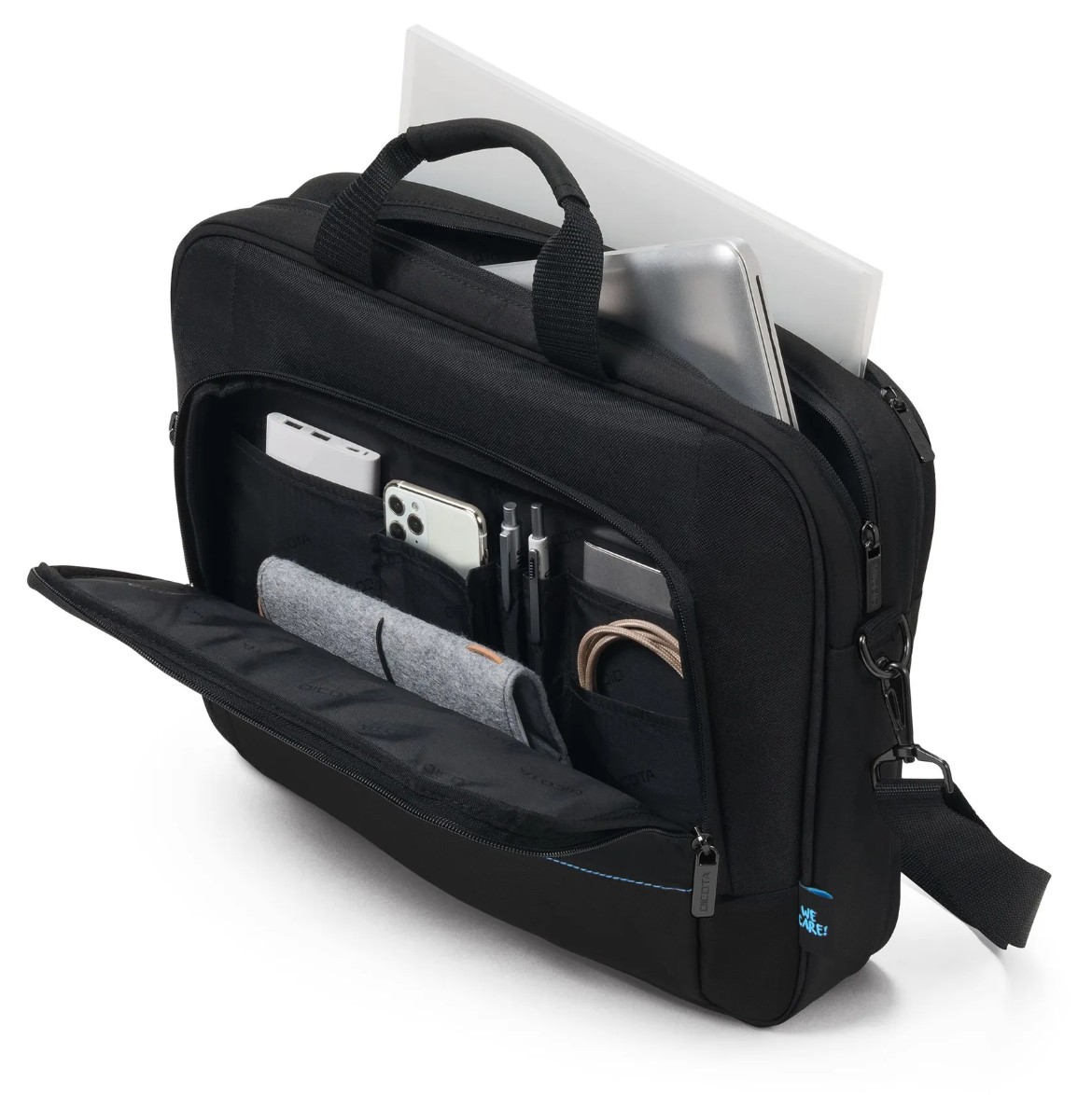 Díky klasickému hornímu otvírání lze rychle a snadno vyjmout notebooky a dokumenty. Dobře strukturované přihrádky udržují příslušenství přehledně uspořádané, zatímco polstrované rukojeti zajišťují pohodlí při přenášení.