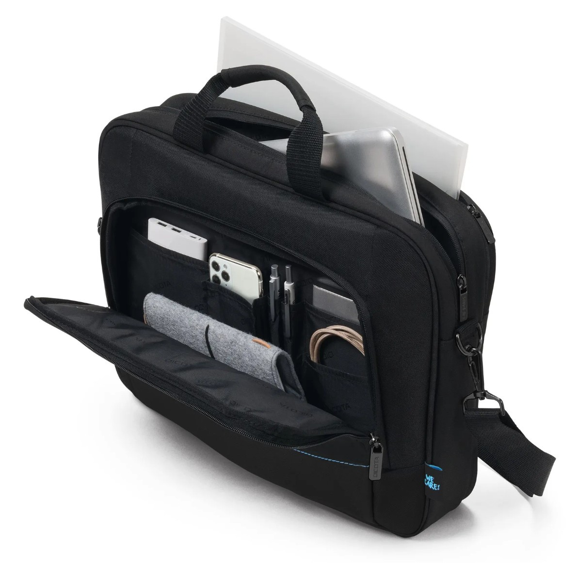 Díky klasickému hornímu otvírání lze rychle a snadno vyjmout notebooky a dokumenty. Přehledně uspořádané přihrádky udržují příslušenství v pořádku a polstrované rukojeti zajišťují pohodlí při přenášení.