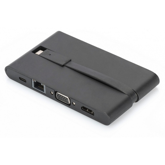 Digirus Univerzální cestovní dokovací stanice, USB 3.1 Type C, 4K, HDMI, VGA, 2x USB-C, 2x USB3.0, RJ45, MicroSD, SD / MMC, černá