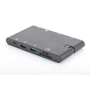 Digirus Univerzální cestovní dokovací stanice, USB 3.1 Type C, 4K, HDMI, VGA, 2x USB-C, 2x USB3.0, RJ45, MicroSD, SD / MMC, černá