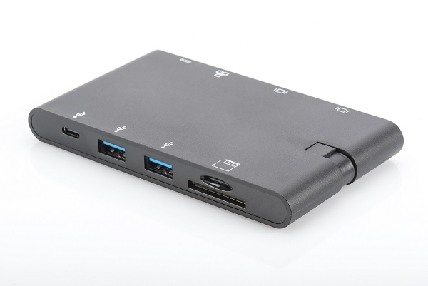 S univerzální cestovní dokovací stanicí USB Type-C ™ od společnosti DIGITUS® máte vždy s sebou nejdůležitější rozhraní. Dokovací stanice rozšiřuje váš notebook o devět dalších portů. Nabízí dvě obrazová rozhraní (HDMI a VGA). Nejvyšší možné podporované rozlišení (HDMI): Brilantní UHD (4K2K / 30 Hz). Kromě toho nabízí dva porty USB 3.0, jeden slibuje nabíjecí funkci také pro mobilní zařízení (BC 1.2). Stejně tak nabízí dva porty USB-C ™ - 1x přenos dat, 1x napájení (PD 3.0). Notebook lze také připojit k síti kabelem přes port Gigabit Ethernet. Celá věc je zakončena dvěma čtečkami karet (MicroSD, SDHC, SDXC / MMC). Díky kompaktním rozměrům, nízké hmotnosti a stohovatelnému připojovacímu kabelu je dokovací stanice perfektním společníkem při cestách ven a cestování.