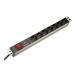 1U hliníkový PDU, stojanový, 7x bezpečnostní vývod 16A zástrčka, 250VAC 50/60 Hz, vypínač, přepěťová ochrana