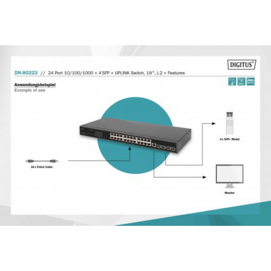DIGITUS 24 GEporttový L2+ přepínač 4 SFP+ UPLINK 19"