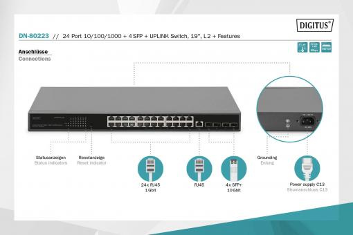 DIGITUS 24 GEporttový L2+ přepínač 4 SFP+ UPLINK 19"