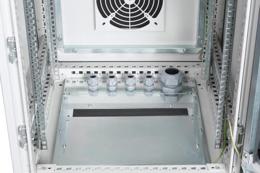 Průmyslové skříně 483 mm (19 ") jsou chráněny proti vniknutí prachu a vody v souladu s bezpečnostní úrovní IP55 (IEC EN 60529), aby poskytovaly optimalizované podmínky pro uživatelsky přívětivou instalaci aktivních a pasivních součástí sítě doprovázených úhledným vedením kabelů v barva je tvořena 70-90 µm silným práškovým nátěrem v barvě šedé (RAL 7035) se schopností přilnavosti podle EN ISO 2409: třída 0 až 1. Další provedená 500 hodinová zkouška odolnosti vůči postřiku solí potvrzuje možný rozsah provozních teplot od -25 ° C do +70 ° C. Vnitřní montážní profilové lišty 483 mm (19 ”) (dva páry = 4 kusy) jsou galvanicky pozinkovány a označeny výškovými jednotkami (počítatelné z obou směrů). jsou variabilní v hloubce a jsou spojeny s přídavnými podpůrnými tyčemi pro realizaci rozsáhlých instalací zařízení o délce 483 mm (19 ”). Dále je uvnitř konstrukce otočného profilu s otvory. Každá skříň je vybavena soklem (výška 100 mm), který nabízí aditio prostor pro kabeláž. Základna každé skříňky je vybavena posuvným kabelovým vstupním panelem s gumovým těsněním a pěti kabelovými vstupy PG (4x PG21 + 1x PG48). Rozsáhlé portfolio příslušenství pro správu kabelů, police atd. Pomůže splnit mnoho požadavků při každodenním používání.