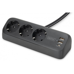DIGITUS 3cestný kancelářský prodlužovací kabel s 2x USB-A a 1x USB-C porty, černý
