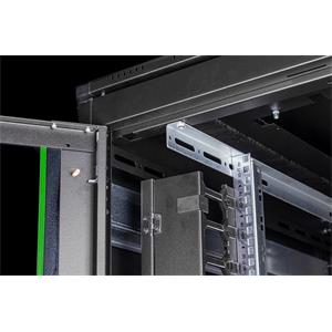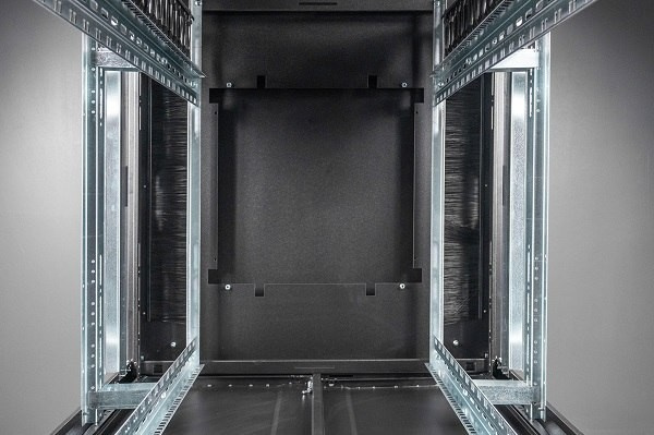 Velkoryse dimenzované vertikální kabelové kanály s vedením kabelů a ozdobným panelem zabudovaným do předního panelu