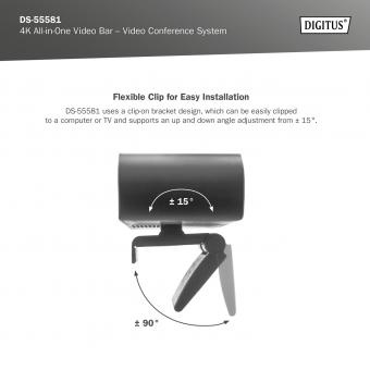 Videokonferenční systém DIGITUS® 4K kombinuje kameru, mikrofon a reproduktor v jednom zařízení a je vhodný pro malé až středně velké místnosti. Video bar se snadno připojuje k notebooku nebo počítači přes USB, napájení je také zajištěno stejným kabelem USB. Díky technologii Plug-and-Play je instalace velmi snadná, není vyžadován žádný další software. Součástí dodávky je dálkové ovládání pro pohodlné ovládání rozsahu funkcí.