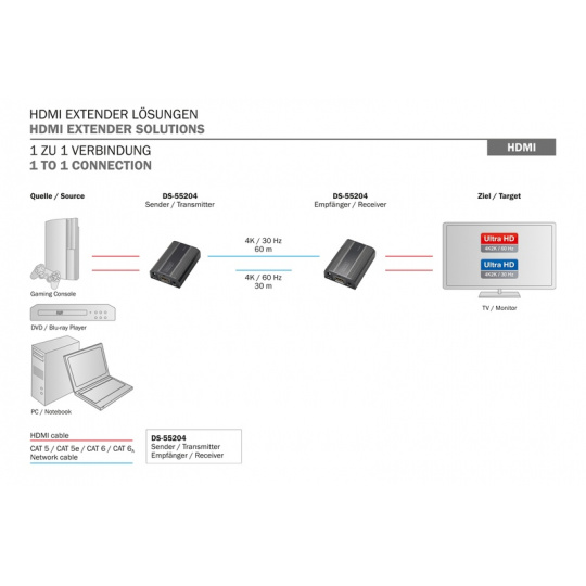 DIGITUS 4K HDMI 2.0 Extender Set, UHD 4K * 2K @ 60 Hz 30/60 m přes síťový kabel (kat. 6, 6a, 7),