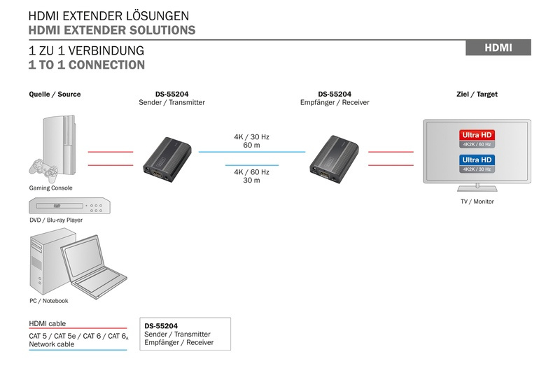 Prodlužuje maximální délku kabelů HDMI až na 60 m, přičemž mezi vysílačem a přijímací jednotkou se používá pouze jednoduchý síťový kabel.