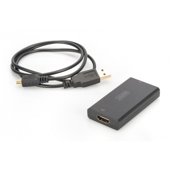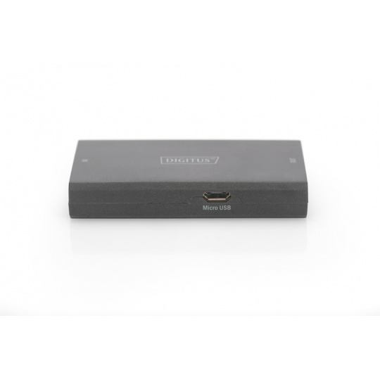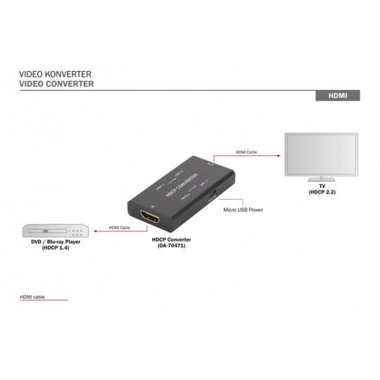 Převodník Digitus HDMI HDCP řeší problémy s přenosem signálu HDMI, pokud zdroj signálu a výstupní zařízení používají různé verze HDCP. Umožňuje obousměrný převod verze HDCP (1.4 na 2.2 nebo 2.2 na 1.4). Napájení je dodáváno pomocí přiloženého kabelu micro USB.