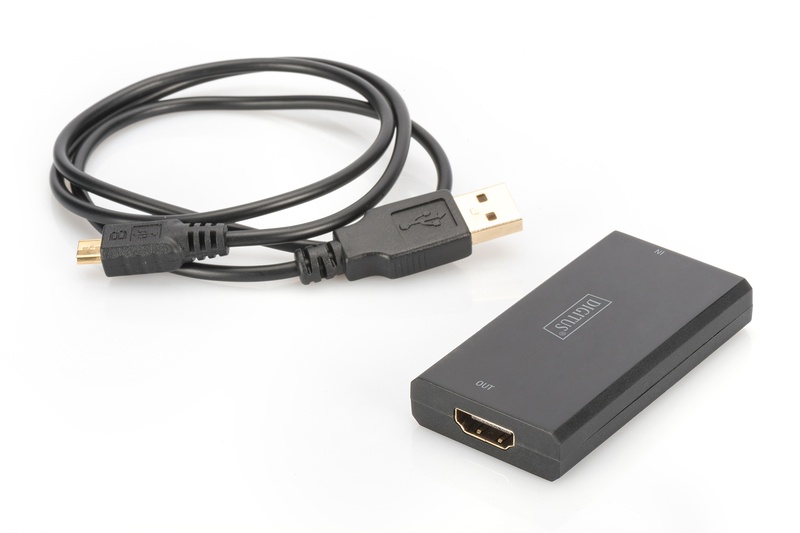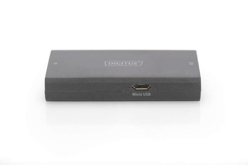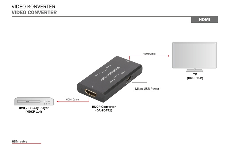 Převodník Digitus HDMI HDCP řeší problémy s přenosem signálu HDMI, pokud zdroj signálu a výstupní zařízení používají různé verze HDCP. Umožňuje obousměrný převod verze HDCP (1.4 na 2.2 nebo 2.2 na 1.4). Napájení je dodáváno pomocí přiloženého kabelu micro USB.
