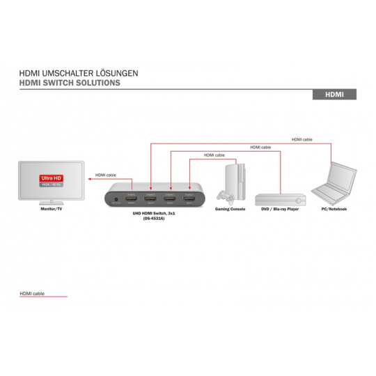 Přepínač Digitus 4K HDMI 3x1 umožňuje pohodlně přepínat mezi 3 vstupními zdroji HDMI (DVD / Blu-Ray Player, herní konzole, streaming boxy , digitální přijímače atd.) Pomocí dálkového ovládání, inteligentního automatického rozpoznávání nebo alternativně přepínáním samotný spínač. Potíže s připojováním kabelů jsou minulostí. Díky podpoře Ultra HD 4K (60 Hz) zažijte svůj mediální obsah v brilantně ostrém rozlišení.