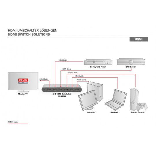 Přepínač Digitus 4K HDMI 5x1 umožňuje pohodlně přepínat mezi 5 vstupními zdroji HDMI (DVD / Blu-Ray Player, herní konzole, streaming boxy, digitální přijímače atd.) Pomocí dálkového ovládání, inteligentního automatického rozpoznávání nebo alternativně přepínáním samotný spínač. Potíže s připojováním kabelů jsou minulostí. Díky podpoře Ultra HD 4K (60 Hz) zažijte svůj mediální obsah v brilantně ostrém rozlišení.