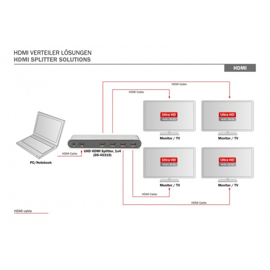 Rozbočovač Digitus 4K HDMI Splitter 1x4 distribuuje signál ze zařízení HDMI až na čtyři obrazovky, televizory nebo projektory v rozlišení 4K (60 Hz). Potíže s připojováním kabelů jsou minulostí. Kromě toho jsou podporovány Full HD a Full 3D. Nabízí ideální řešení pro komerční aplikace, například pro videostěny nebo prezentace produktů (kancelářské / obchodní prostory, výstavní stánky, výkladní skříně, čekárny, restaurace atd.), Stejně jako v soukromých prostorách ( domácí kino).