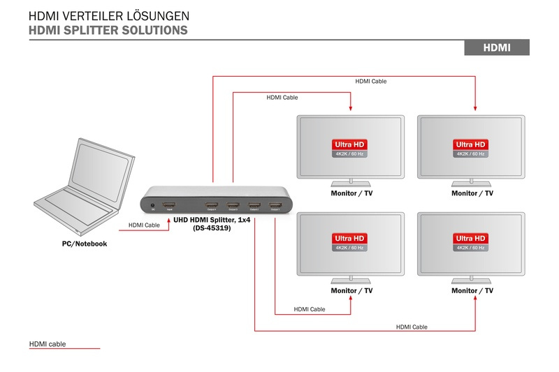 Rozbočovač Digitus 4K HDMI Splitter 1x4 distribuuje signál ze zařízení HDMI až na čtyři obrazovky, televizory nebo projektory v rozlišení 4K (60 Hz). Potíže s připojováním kabelů jsou minulostí. Kromě toho jsou podporovány Full HD a Full 3D. Nabízí ideální řešení pro komerční aplikace, například pro videostěny nebo prezentace produktů (kancelářské / obchodní prostory, výstavní stánky, výkladní skříně, čekárny, restaurace atd.), Stejně jako v soukromých prostorách ( domácí kino).