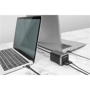 Kompaktní nabíječka pro zařízení, jako jsou notebooky, smartphony nebo tablety. Nejnovější technologie GaN je mimořádně účinná a dokáže nabíjet zařízení až čtyřikrát rychleji než běžné nabíječky.