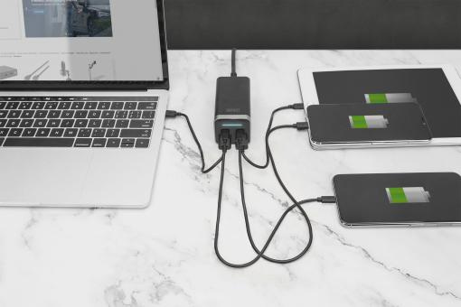 Čtyřportový nabíjecí adaptér USB od společnosti DIGITUS® je výkonné nabíjecí řešení pro každodenní použití s nejnovější technologií GaN. Vysoce výkonný adaptér má maximální výstupní výkon 65 W. Je vybaven 2x porty USB-C a 2x porty USB-A, podporuje celkový výkon až 65 W, a proto může nabíjet 4 zařízení současně. Je kompatibilní s nejběžnějšími protokoly rychlého nabíjení, a proto je kompatibilní téměř se všemi zařízeními. Integrovaná ochrana proti přepětí, nadproudu a zkratu zajišťuje větší bezpečnost. Integrovaná ochrana proti přehřátí navíc zabraňuje možnému přetížení a poškození nabíječky nebo připojených zařízení.