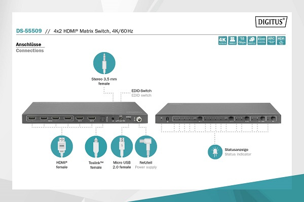 DIGITUS 4x2 HDMI Matrix Switch, 4K/60Hz Scaler, EDID, ARC, HDCP 2.2, 18 Gbps