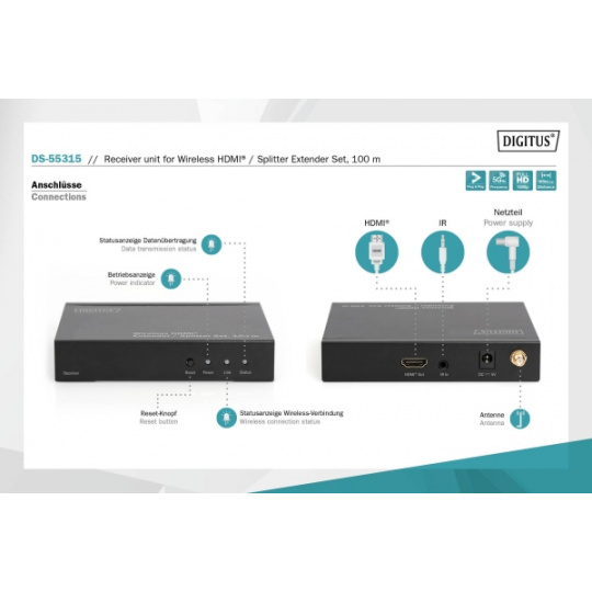 DIGITUS Bezdrátový HDMI Extender, přijímací jednotka, 5 GHz Full HD, 1080p, pro rozbočovací funkci