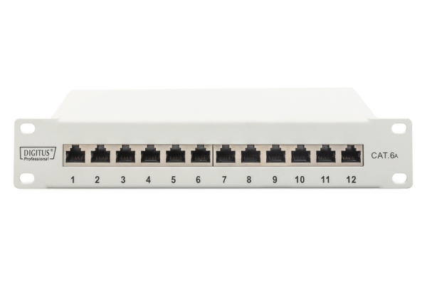 DIGITUS CAT 6A Patch Panel, stíněný, 12-portové pole se štítkem, 1U, 10 "montáž do stojanu, šedá RAL 7035