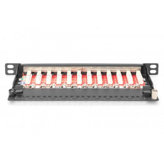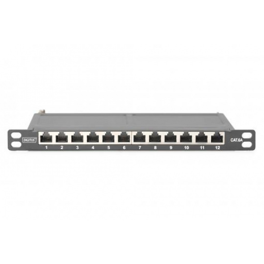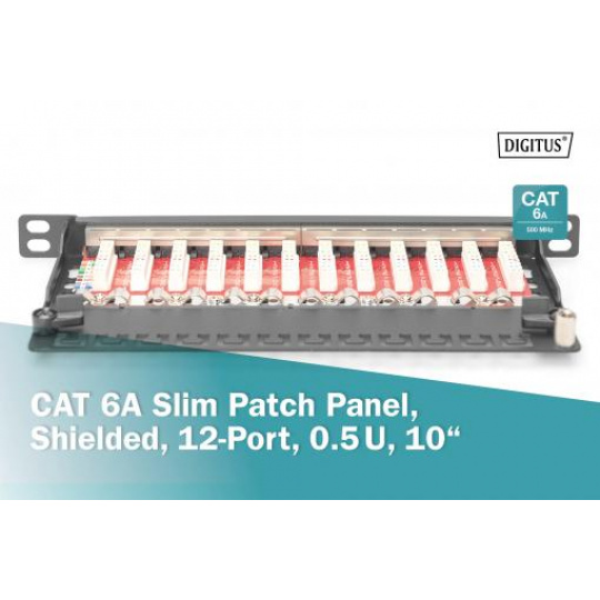 DIGITUS CAT 6A, propojovací panel třídy EA, stíněný, 12 portů, 0,5U, 10 ", černý