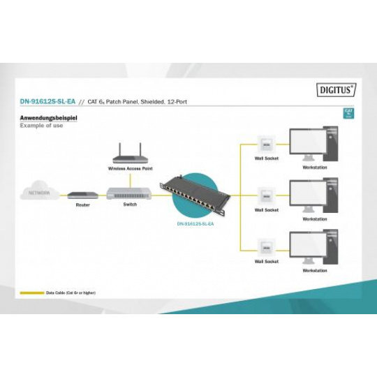 12portový propojovací panel DIGITUS® 0,5U nabízí vysokou hustotu. Protože panel má výšku pouze 0,5 U, umožňuje prezentovat 24 portů na 1U (2 panely po 12 portech), které lze nainstalovat. Vyhovuje standardu 802.3at PoE + a standardu 802.3af PoE.