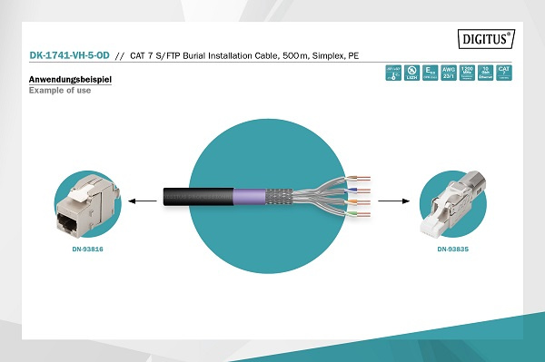 Digitus® Professional Cat.7 S/FTP kabel pro instalaci do země se vyznačuje následující konstrukcí kabelu 4x2x AWG23/1 a dosahuje přenosové frekvence až 1200 MHz. Kabel má vnější PE plášť a vnitřní bezhalogenový plášť a odpovídá normě IEC 60332-1, FRNC-B, LSZH-1 a CPR Euro třídy Eca. Kabel je vhodný pro instalaci v suchých i vlhkých prostorách, ve venkovním prostředí nebo v zemi. Vyhovuje následujícím normám ISO/IEC 11801, DIN EN 50173, DIN EN 50288-4-1.